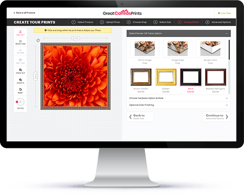 For canvas prints that are to be displayed without frames, Great Canvas Prints offers different types of wrapping options for a sleek, modern look. Get your photo wrapped around the canvas edges or opt for a colored wrap that complements the interiors of your home.